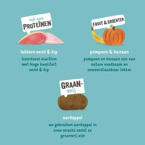 In deze graanvrije jerky zitten er alleen goede dingen. Traag gegaarde stukjes premium kip en eend met koolzaadolie om het lekker sappig te houden. Plus pompoen en banaan als extra voedzaamheidsbonus. De snacks zijn verpakt in 100% biologisch afbreekbare wikkels (high paw voor de planeet!).