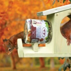 Eekhoorns zijn intelligente dieren en leren snel hoe zij bij allerhande lekkernijen kunnen komen, hoe moeilijk dat soms ook lijkt te zijn. Het dak sluit weer op het moment dat de eekhoorn klaar is met eten zodat andere dieren en vogels niet bij het voer kunnen. Het eekhoornvoederhuisje is gemaakt van massief weerbestendig hout en is voorzien van een ophangblok voor montage tegen een muur of boom.