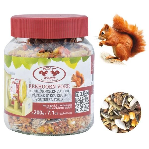 Handig potje met 200 g gezond eekhoornvoer. Eekhoorn voedermix, speciaal uitgebalanceerd op basis van noten, diverse natuurlijke pitten, mais en vetten. De eekhoorns eten ter plekke deze lekkernij op of bouwen er elders een voorraadje voor de winterdag mee op. Bovendien laat de eekhoorn zich makkelijker bekijken als hij zit te eten. In de herfst eet de eekhoorn extra veel om een vetlaag voor de winter op te bouwen.