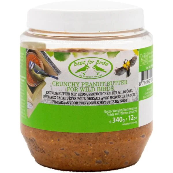 Pot ongezouten pindakaas met stukjes noot speciaal voor onze tuinvogels. Pindakaas gemaakt voor menselijke consumptie bevat teveel zout en kan schadelijk zijn voor de vogels in uw tuin. Koolmezen en pimpelmezen zijn verzot op pindakaas.
