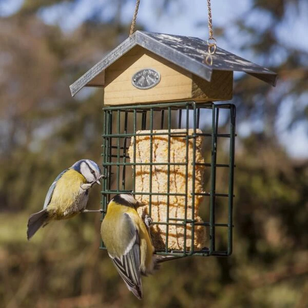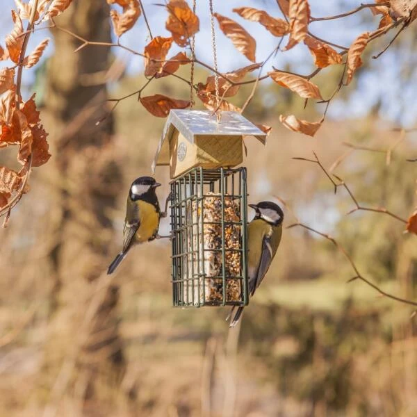 Door de open structuur van de houder kunnen meerdere vogels tegelijk van deze vetblok smullen. Met de lange metalen ketting hang je deze houder vlot op in een boom, struik of aan een voederhaak.