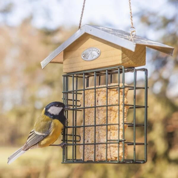 Vogels hebben onze hulp tijdens de koude wintermaanden hard nodig. Deze vetblokhouder mag dan ook in geen enkele tuin ontbreken. In de houder die makkelijk kan geopend worden, past een standaard vetblok. Door het voorziene zinken dak, zal de vetblok beschermd zijn tegen de regen en langer vers blijven.