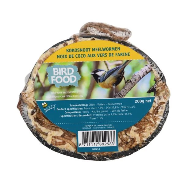 Een halve kokosnoot gevuld met een meelwormen, ideaal als aanvullend voeder voor tuinvogels in de winter.