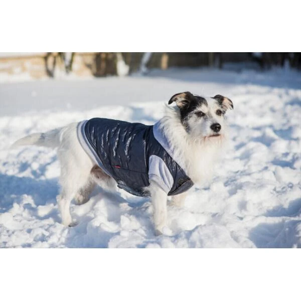 Een hondenjas met kap gemaakt uit een waterdichte gewatteerde stof gecombineerd met een zachte stof. Voelt comfortabel aan en geeft de hond de nodige bescherming.