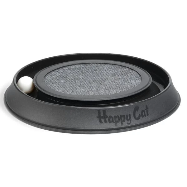 De Happycat heeft aan de buitenzijde een gleuf waar een balletje in zit. Op actieve momenten kan de kat hier mee spelen en het balletje oneindig laten ronddraaien zonder dat het door de woning zal rollen en onder de kast terecht komt. Het is een afleiding en zeker aan te raden bij katten die niet naar buiten kunnen. Het stimuleert de kat om te bewegen wat goed is voor de fysieke en mentale gezondheid van het dier.