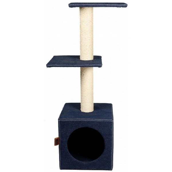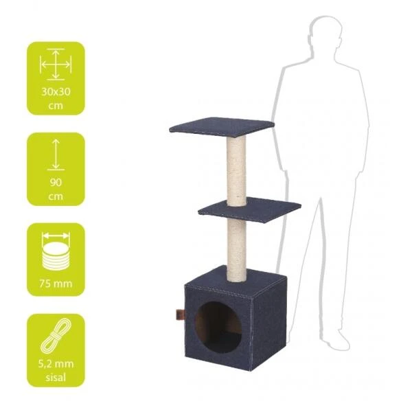 De krabmeubel Palazzo is een klassieker in een stoer, modern jasje! De hoogwaardige denim bekleding zorgt ervoor dat de kat zijn geuren kan achterlaten en is goed opgewassen tegen de scherpe nagels van de kat. Om de nagels goed aan te scherpen biedt het sisal rondom de paal voldoende krablengte.