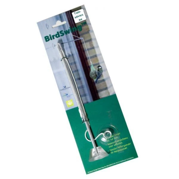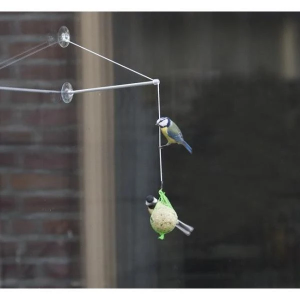 De voederschommel hang je op door de zuignappen vochtig te maken en tegen een raam aan te drukken. Onderaan het touw is er een haakje voorzien om vetbollen of pindanetjes aan te hangen.
