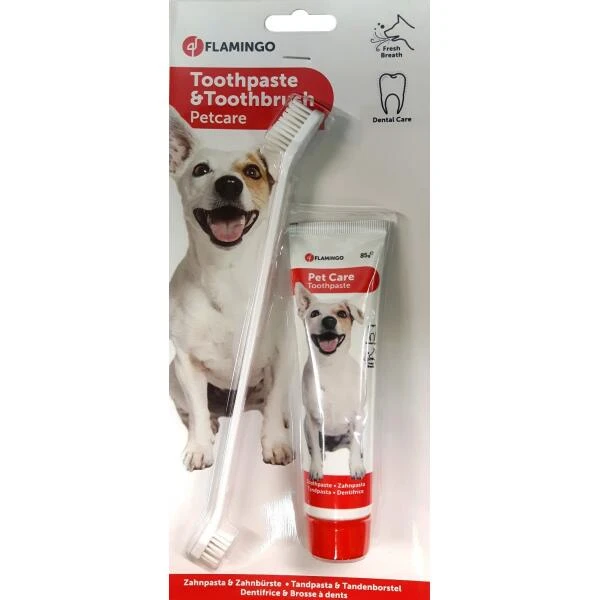 Een tandenborstel met tandpasta om het gebit van jouw hond te verzorgen. De tandpasta biedt een totale bescherming van het gebit van jouw geliefde huisdier en zorgt voor een frisse adem.