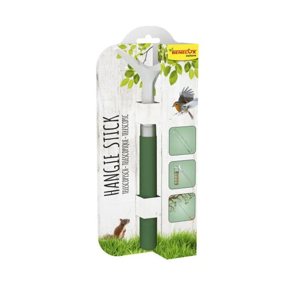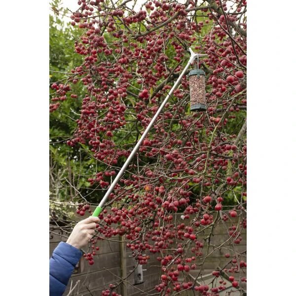De telescopische steel is uitschuifbaar tot 85 cm en is voorzien van een haak waaraan je de silo kan hangen. Met de zachte antislip handgreep hang je zonder moeite het voedersysteem op aan een hogere tak.