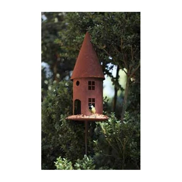 Het leuke voederhuis kan met de bijgeleverde stang makkelijk in de grond worden geprikt. Het geheel is met de hand gemaakt uit speciaal gevormd en behandeld metaal met een roestige look.