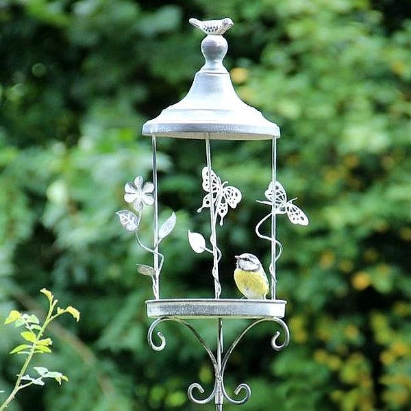 Een prachtig voederhuisje met een romantische look om de vele vogels in jouw tuin te verwennen met zaden, pitten en noten. Het huisje is gemaakt uit metaal met een grijs verouderde tint. De decoratieve blaadjes en vlinders aan de zijkant en het vogeltje bovenop het dak maken het geheel decoratief.