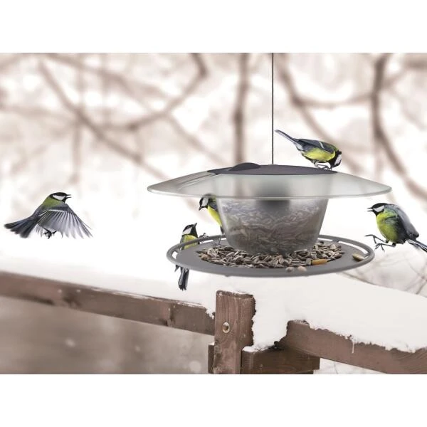 Dit hangende model in kunststof bestaat uit drie onderdelen en een stalen hanglus. De onderdelen klikken gemakkelijk uit elkaar en zijn dus eenvoudig te reinigen. Door het deksel op te liften vul je de silo met gemak, gebruik verschillende voedertypes per seizoen (zadenmixen, zonnebloempitten, etc.).