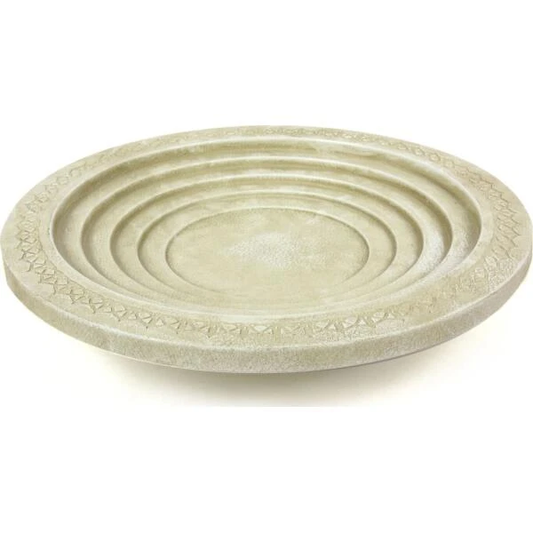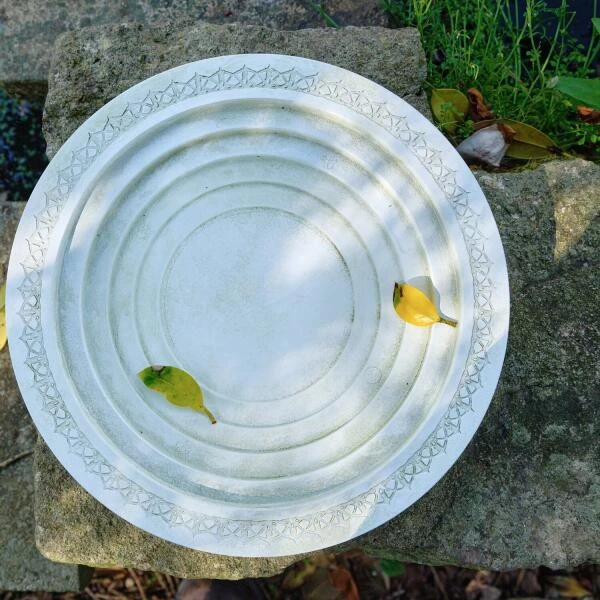 De schaal is afgewerkt met geometrische figuren en groene accenten voor een natuursteen-look zodat het lijkt alsof de schaal al jaren buiten staat. Door de ondiepe treden kunnen ook kwetsbare insecten gebruik maken van de drinkschaal.