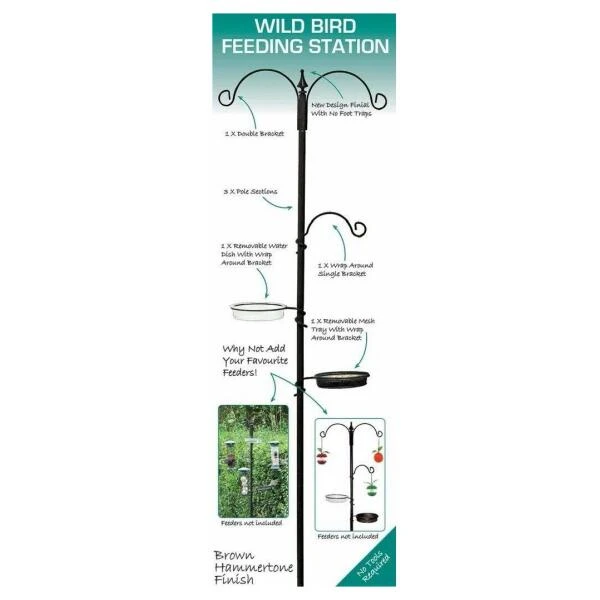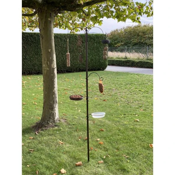 Het voederstation is voorzien van twee haken aan de bovenzijde en een derde haak die je zelf op de gewenste hoogte kan hangen. Er is ook een drinkbakje en een voederschaaltje voorzien. Aan de haken kan je naar eigen keuze gevulde voedersilo’s, vetbollen of netjes met pindanoten ophangen. Zorg voor variatie om verschillende soorten vogels aan te trekken.